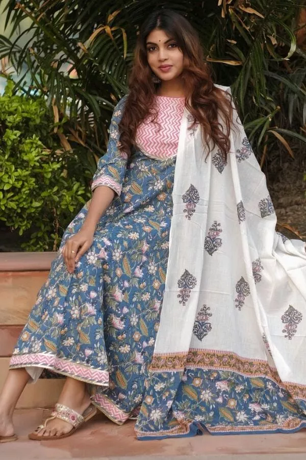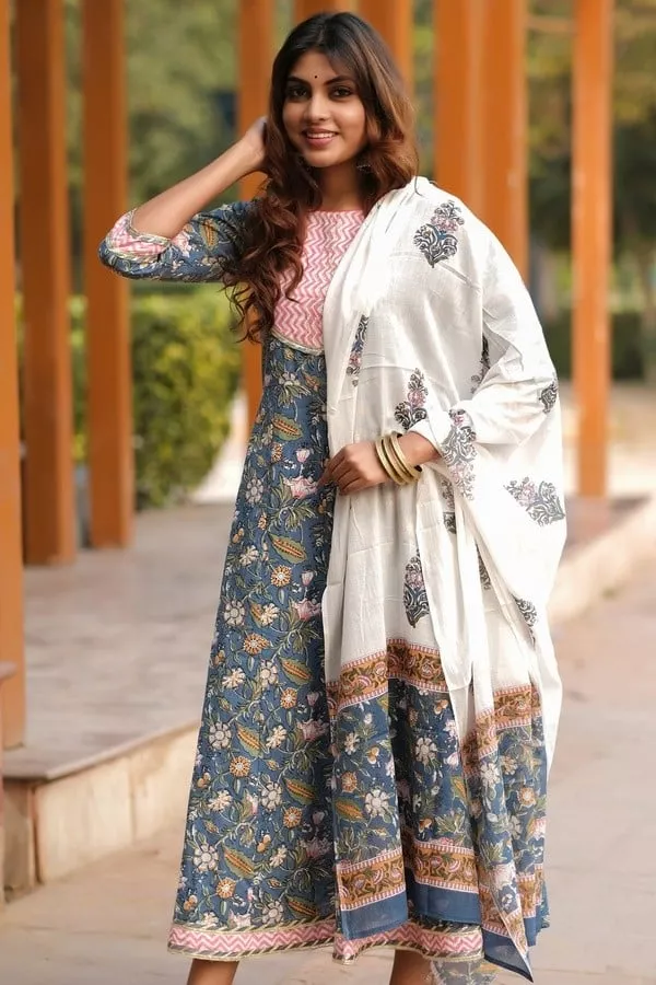 Purelylush Blue & White Pure Cotton Jaipur Ethnic Maxi Dress With Dupatta