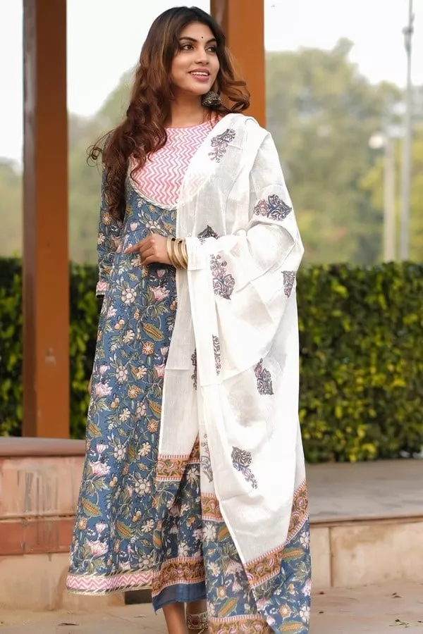Look like a diva in our hand printed Jaipuri kurta set with dupatta, Set the tone for this season with this one-of-a-kind Maxi dress. Wow, your date by pairing this Blue & White Printed piece with platform heels and a chic blazer.