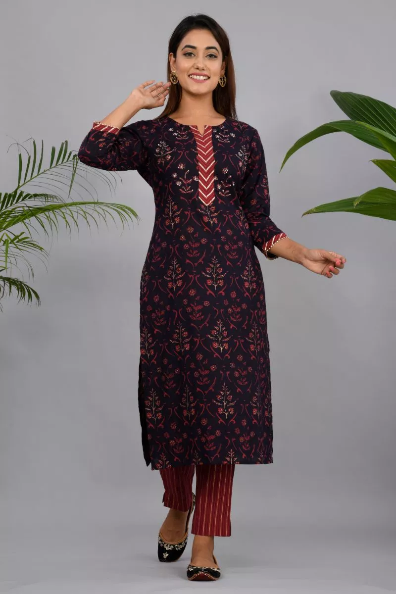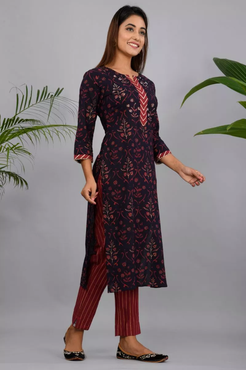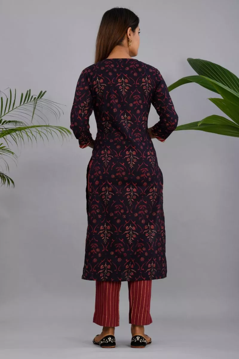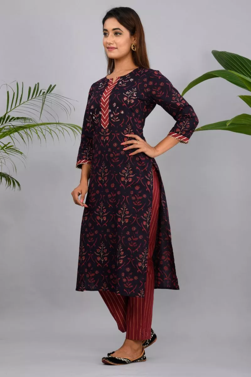 Brown and maroon printed straight calf length kurta with adda work, has a round neck, three-quarter sleeves, straight hem, side slits Brown and maroon striped trousers, has partially elasticated waistband, slip-on closure.